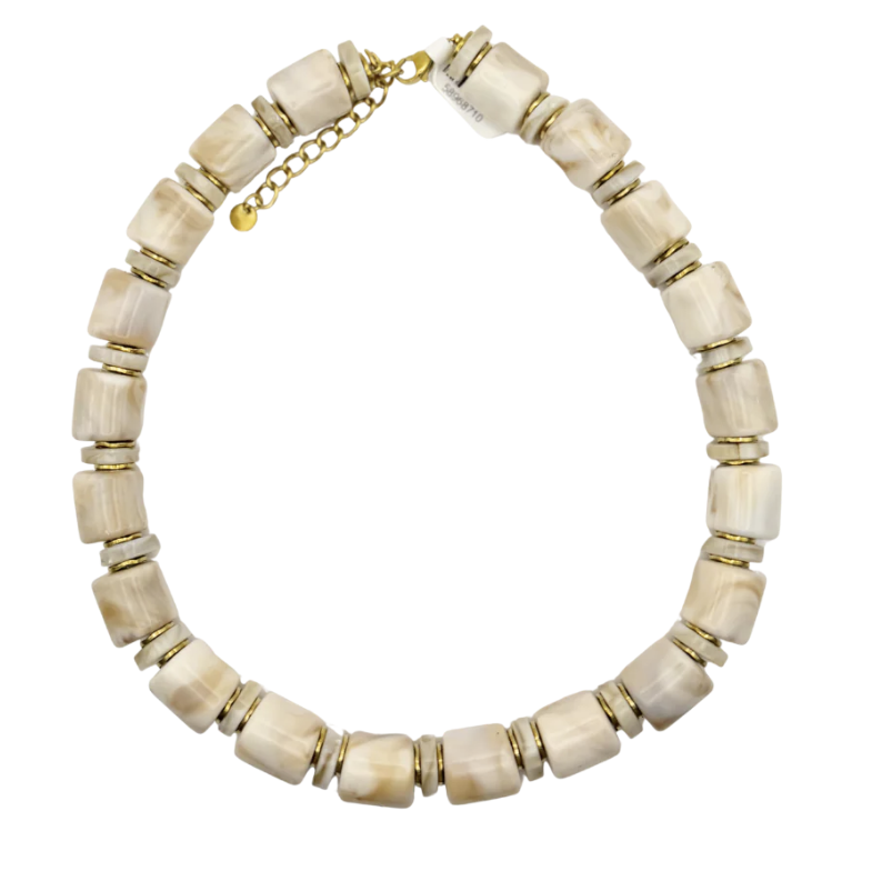 Crafted from premium resin, this bone colored chunky necklace delivers bold visual impact with its distinctive shell-inspired design. The substantial color catches light beautifully, making it an ideal statement piece for layering or wearing solo. Secured with a reliable lobster clasp, this necklace combines durability with contemporary style. Perfect for adding texture and personality to any outfit.