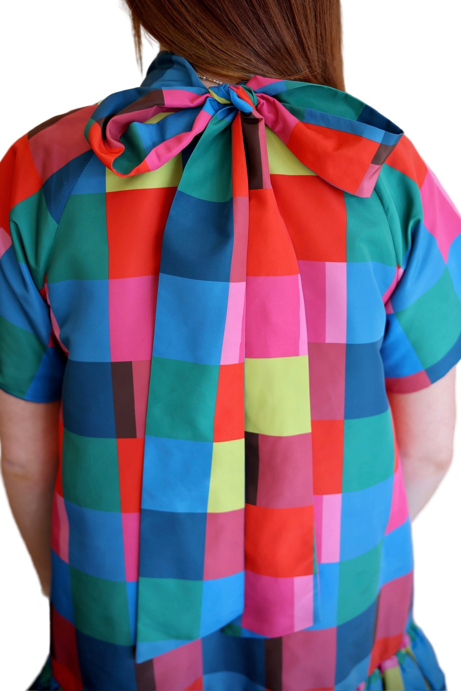 The Willa Dress in the print toile is a playful yet polished statement piece, featuring a bold checkered pattern and a flirty tiered mini skirt. Its short sleeves and high neckline add a touch of elegance to this modern, feminine silhouette.