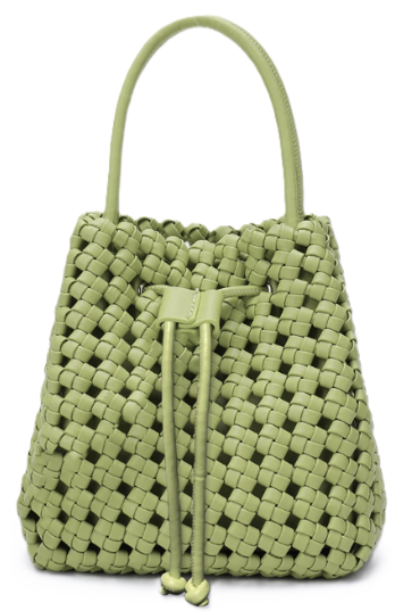 This adorable bag features a beautiful woven square pattern that gives it an instantly artisanal look. The little bucket shape has a cute top handle and cinches closed with a drawstring. It's the perfect statement piece to add a rich, stylish pop to any outfit.