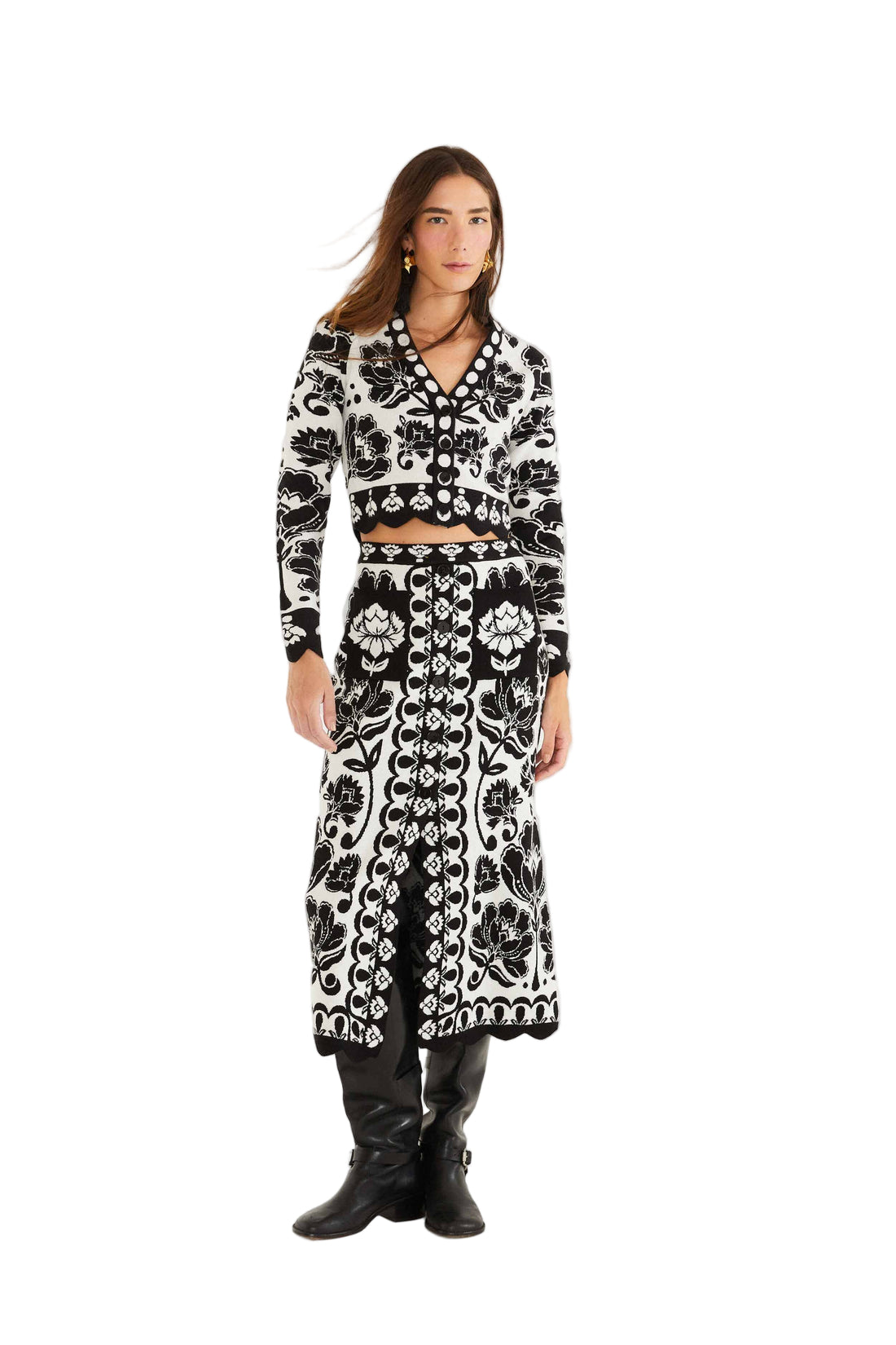 Step into artful elegance with the Black & White Floral Arabesque Knit Skirt by FARM Rio. This captivating piece features a bold monochrome palette adorned with intricate floral and arabesque patterns, creating a striking visual harmony. The knit fabric gently hugs the silhouette, while scalloped edges add a playful, handcrafted touch. With front buttons and cozy pockets, this skirt marries comfort with a distinctive, statement-making charm.