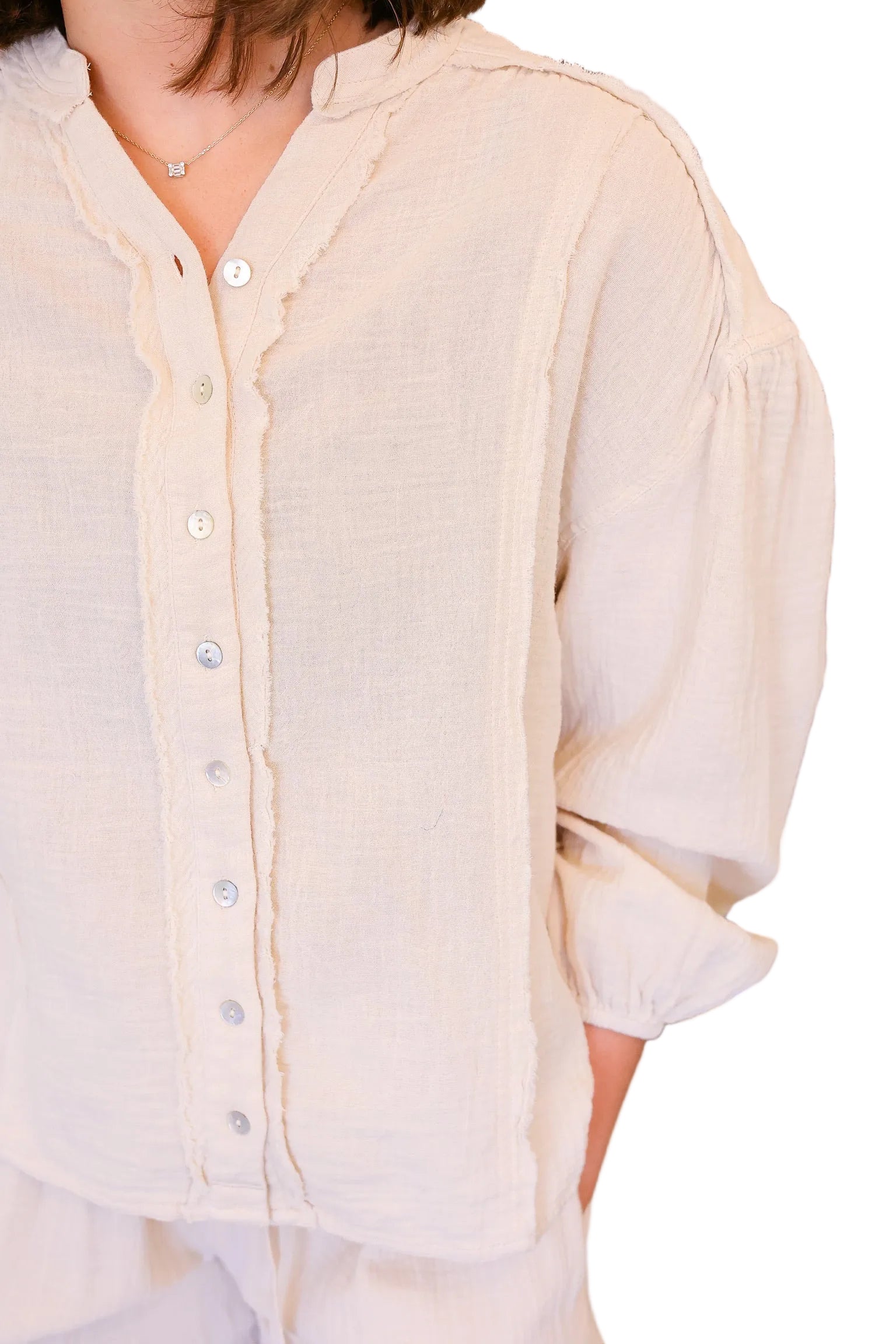 Effortless elegance meets breathable comfort in this light linen button-up. Crafted from soft gauze fabric, it drapes beautifully while keeping you cool and comfortable all day long. The natural tone pairs seamlessly with any wardrobe, making it perfect for layering or wearing solo. Long sleeves offer versatile styling options for any season. A timeless staple that transitions from casual to polished with ease.