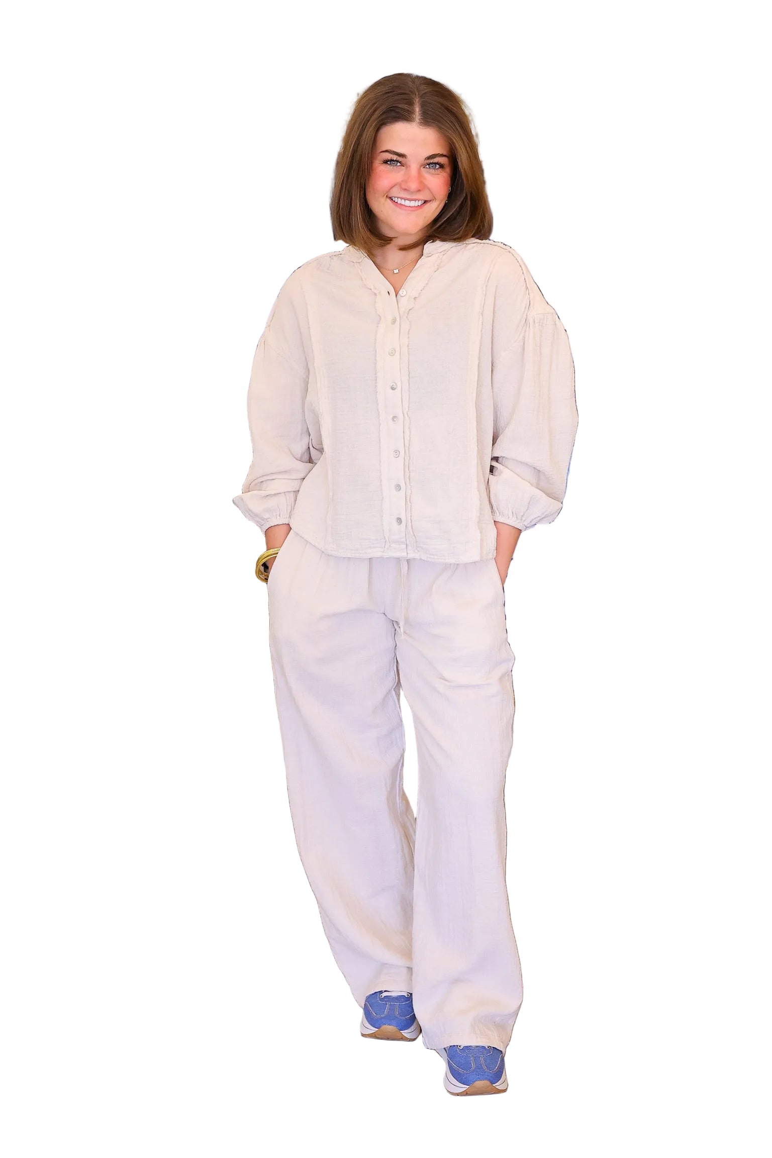 Lightweight and breathable gauze pants in a natural tone, perfect for warm weather and casual comfort. The loose, relaxed fit allows for easy movement, while the soft fabric drapes beautifully. Ideal for layering or wearing solo on hot days. A versatile staple that transitions effortlessly from weekend wear to laid-back evenings.