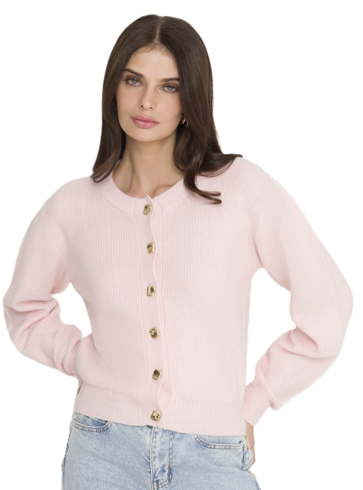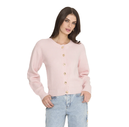 The Savera Cardigan is the perfect blend of sweet and sophisticated. Crafted in a soft pink knit, this classic silhouette is elevated with gold statement buttons that add just the right touch of polish. Wear it buttoned up for a timeless look or layered over a cami for effortless versatility.