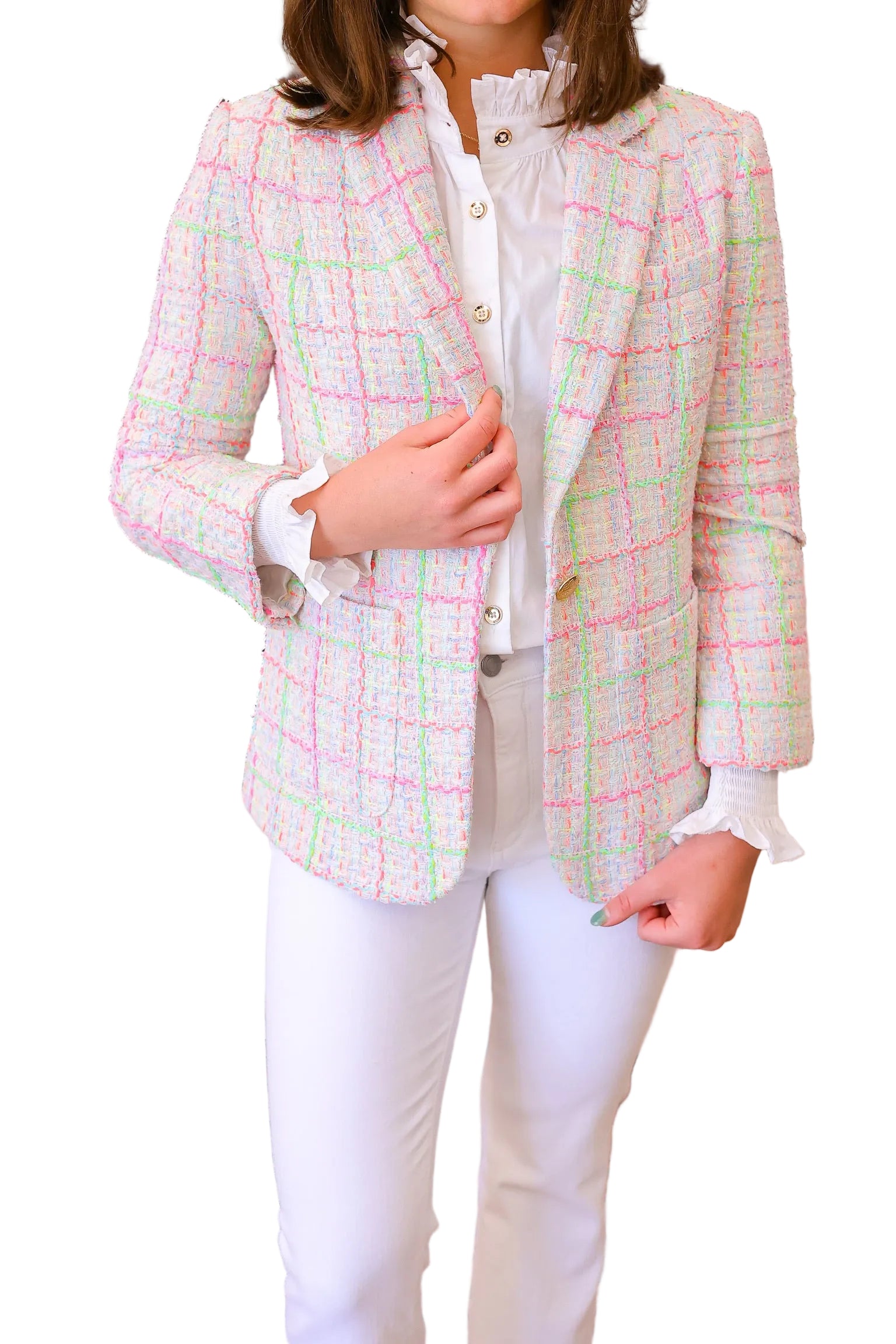 The Holly Jacket in Neon Multi brings vibrant energy to your spring wardrobe. This eye-catching tweed piece features bold neon tones woven throughout, creating a statement-making look that stands out from the crowd. Perfect for layering over basics or wearing as a standalone piece, it adds personality and flair to any outfit. The classic tweed construction ensures durability while the neon colorway keeps things fresh and modern for the season ahead.