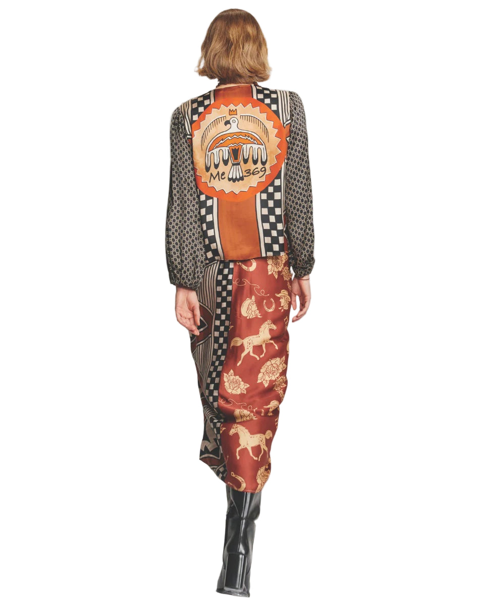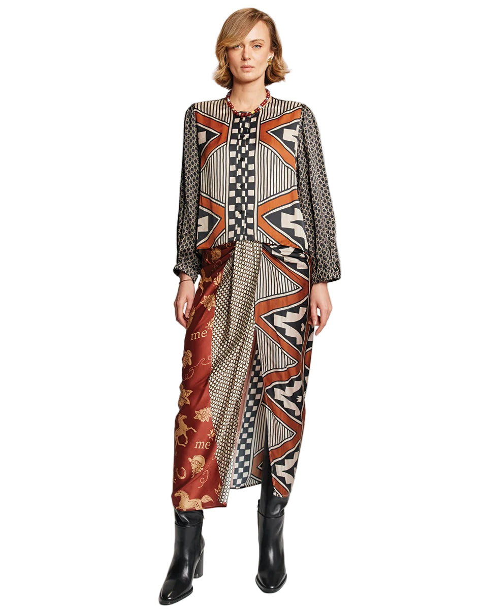 Our Avia button down top is cropped with a round neck and puffy long sleeves with elastic at the wrists. Pair with our Luna tie front skirt for an elegant elevated look.
