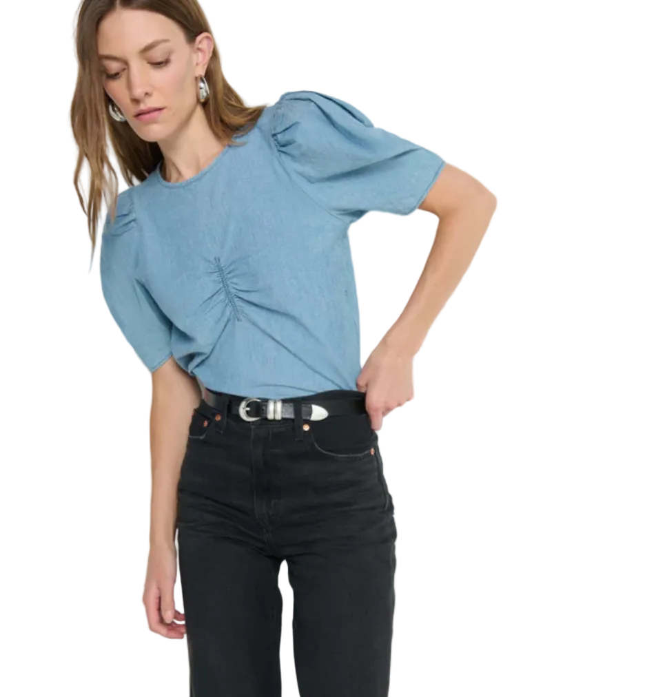 Something special. Subtle shirring and relaxed puff sleeves add structure to the Cecily Baby Doll Top.In soft Portuguese chambray for an effortless feel.