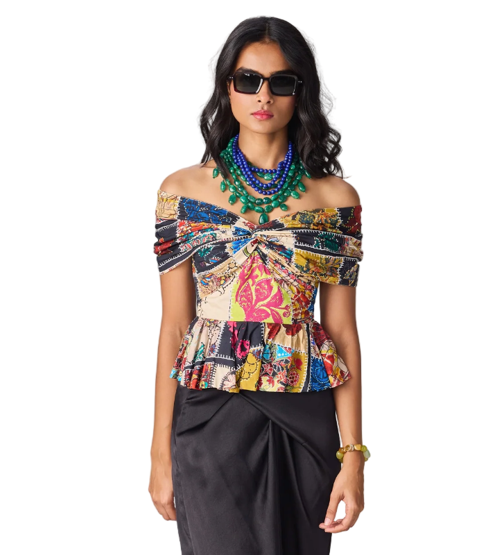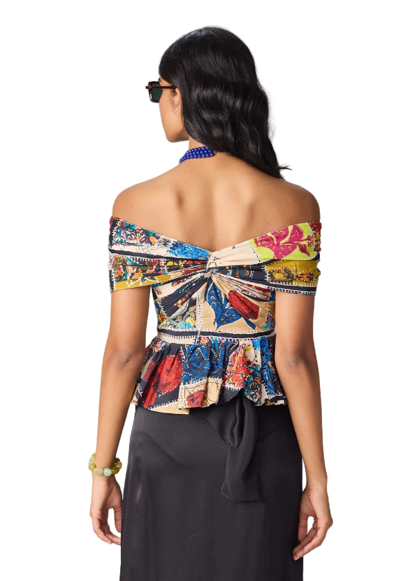 The Chrysa Blouse features an abstract patch work print bow inspired drop shoulder blouse with hand pleats, frill, and knot detailing. Elevate your style and showcase your unique taste with this versatile and fashion-forward blouse.
