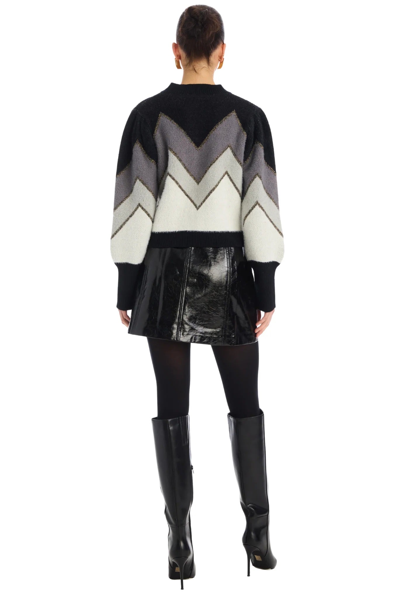 The Fuzzy Chevron Cardigan is a monochrom cozy dream adorned with gold buttons. Slightly cropped in length and designed with a billowing sleeve leading into an elongated ribbed cuff. A hint of metallic throughout makes this sweater perfect to dress up.
