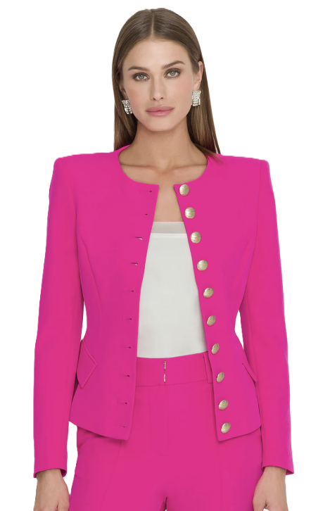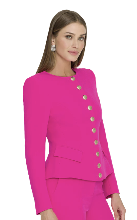 Command attention in the Ophelia Crepe Jacket. This structured peplum silhouette, tailored from stretch crepe, features stacked gold buttons and a cinched waist for a sharply defined shape. The bright magenta adds a refined pop of color—perfect for modern suiting or an elevated denim pairing.