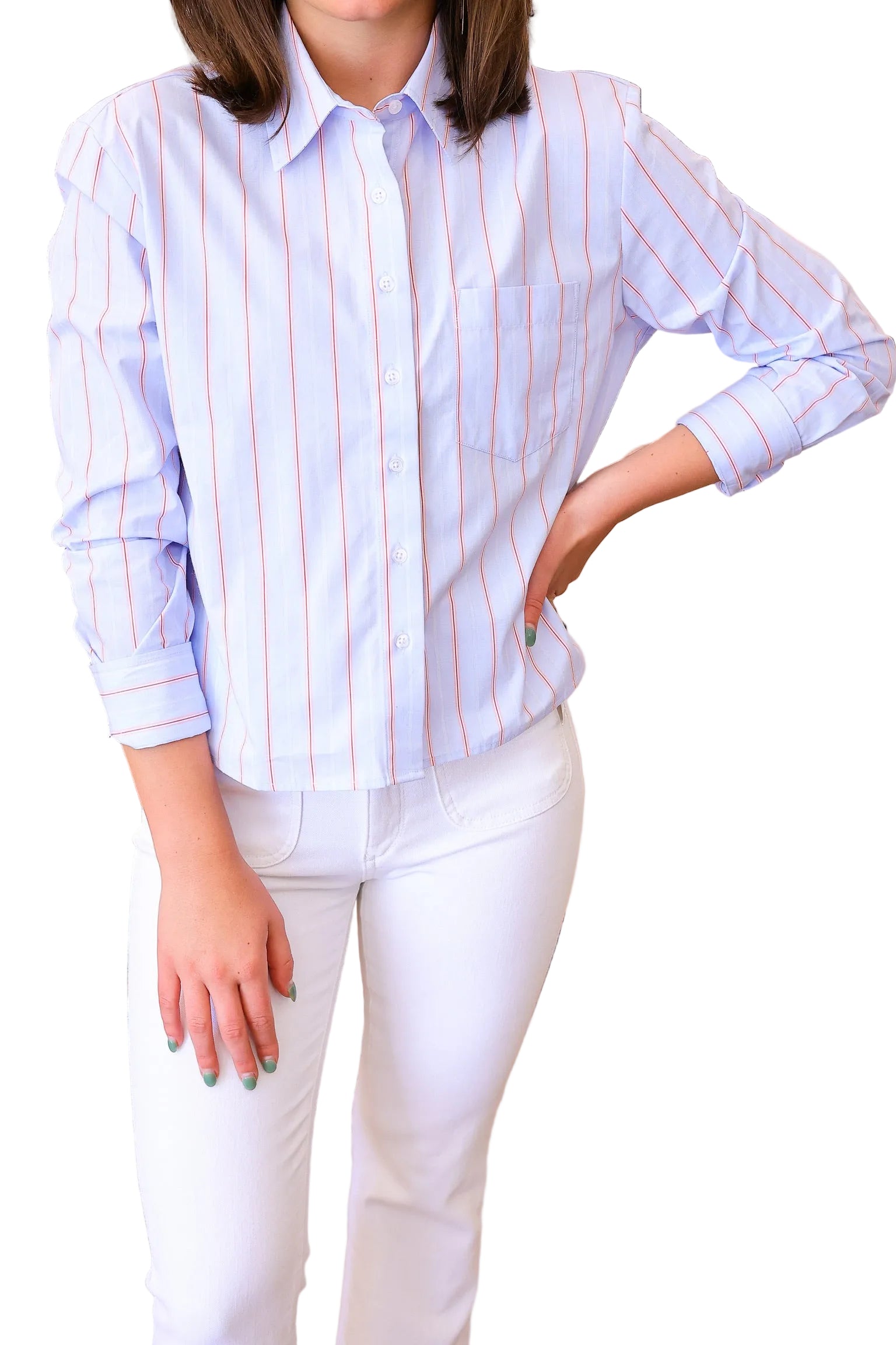 The LS Boxy Crop from The Shirt delivers effortless style with its relaxed, oversized silhouette and cropped length. Featuring a vibrant micro stripe pattern in blue, pink, and red, this button-up shirt works equally well layered over basics or worn solo. The boxy fit provides comfortable movement while maintaining a contemporary edge, making it a versatile addition to any wardrobe. Perfect for casual days or dressed-up occasions.